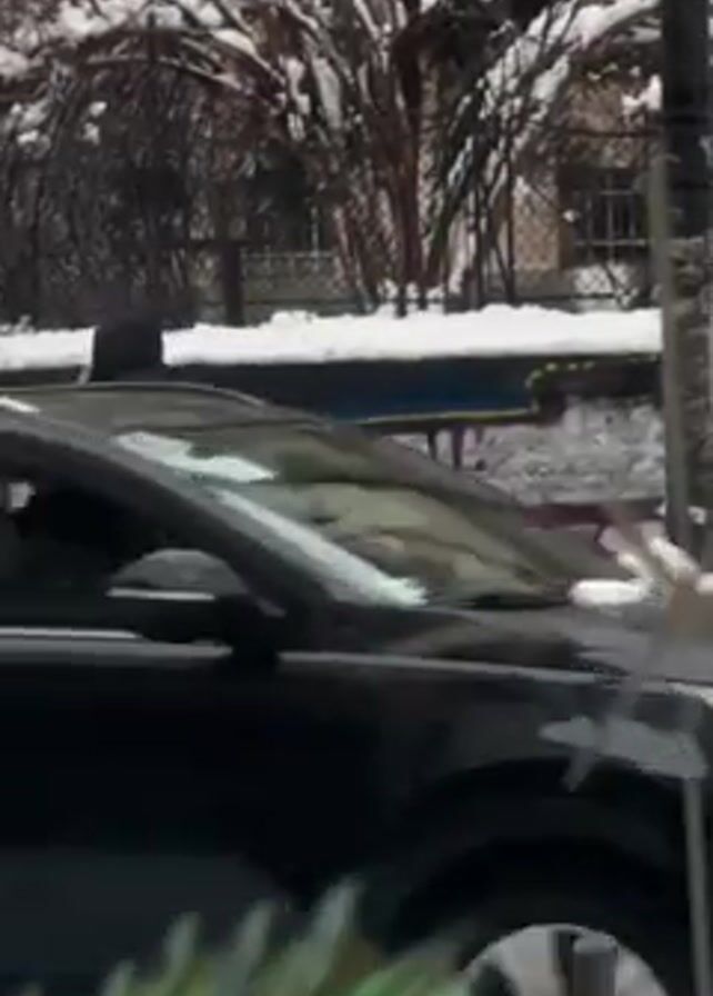 The video depicts a snowy street scene. A black Audi A6 is parked on the side of the road, partially covered in snow. A person wearing a dark hooded coat stands near the car, potentially taking pictures with a phone. Another black car drives past. Subsequently, a person in a beige winter coat with a backpack walks along the sidewalk. A wall covered in graffiti is visible in the background, along with snow-covered trees and a power pole.