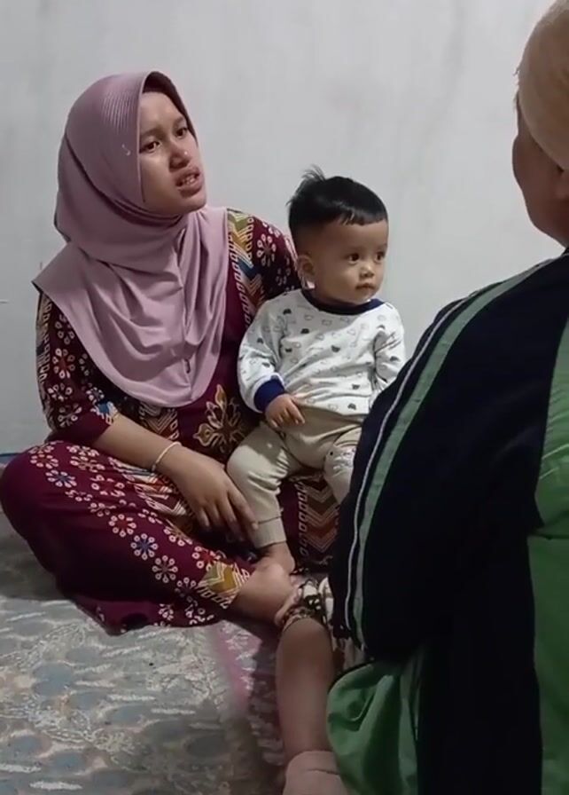 Three individuals are present in the video. A woman wearing a maroon-patterned dress and a light purple hijab sits cross-legged on a patterned rug, holding a young child dressed in white and beige clothing on her lap. Both are facing another person, likely an older woman, who is partially visible. The older woman is wearing dark and green clothing. The setting appears to be indoors against a plain, white wall. The woman on the rug is speaking, and looks to be crying. The child is looking at the older woman.