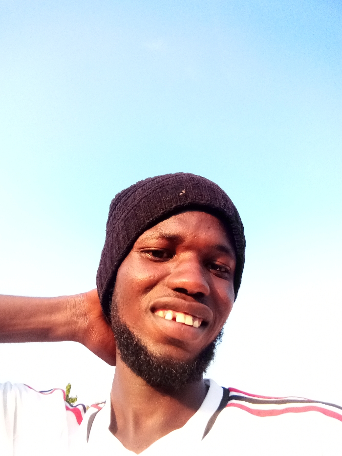 A young man poses outdoors, wearing a black beanie, white shirt with striped sleeves, and sporting a well-trimmed beard. He has dark skin and a broad smile, revealing a gap in his front teeth. His left hand is raised, resting at the back of his neck. The background is a clear, light blue sky, suggesting a sunny day. The overall composition is a casual selfie.