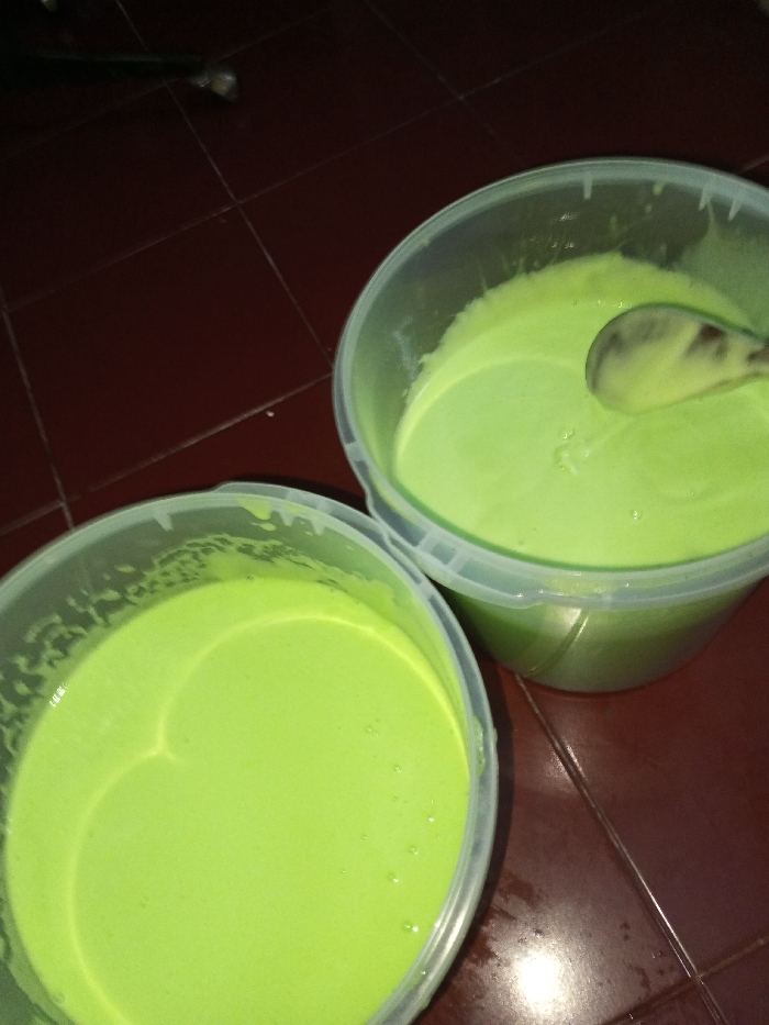 Two transparent plastic buckets containing a vivid chartreuse-green, opaque liquid are positioned on a reddish-brown tiled floor with visible grout lines. A wooden spoon, partially coated with the green liquid, rests within the liquid in the upper right bucket. The liquid in the lower left bucket exhibits a smooth surface. The ambient lighting appears dim, reflecting off the liquid and plastic surfaces. The immediate background beyond the floor is dark and indistinct. This scene is located in Ciherang, Indonesia.