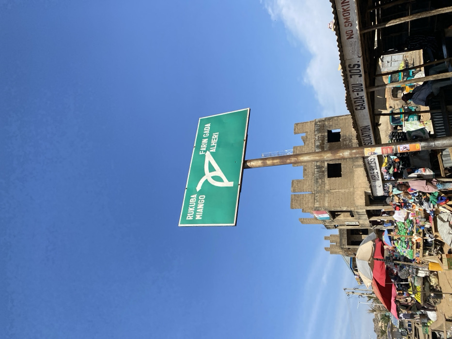 The scene depicts an active outdoor market in Kabong, Nigeria, under a clear blue sky with minimal cloud cover