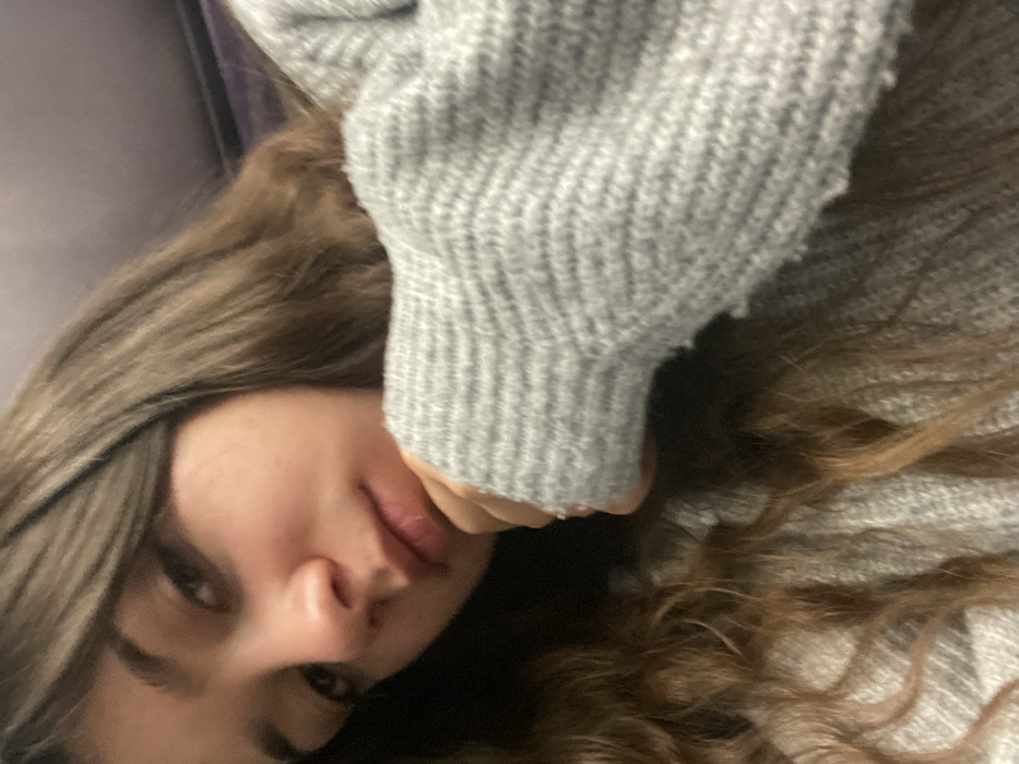 A close-up, angled portrait features a young female individual from the mid-chest upwards, situated slightly to the right of the frame, looking directly towards the camera. Her head is tilted, and her right hand supports her chin, with her fingers curled. She wears a light grey, heathered knit sweater with a prominent horizontal rib pattern on the sleeve. A metallic ring is visible on her right ring finger, partially obscured by the sweater cuff. She has long, wavy, medium-brown hair that falls over her shoulders. Her eyes are dark, and her facial expression is neutral. The background is dark and indistinct, offering no discernible environmental features. The exact location within Schwindratzheim, France, cannot be determined from the visual information presented in the image.