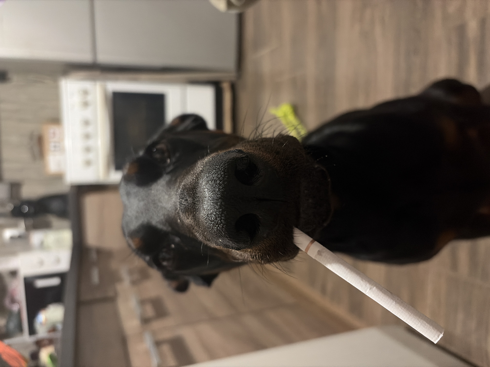 A black and brown Doberman Pinscher dog is holding a white cigarette in its mouth. The dog is in a kitchen. The kitchen contains a white microwave oven and light-colored cabinets. The location in the city of Sofia, Bulgaria is not discernible from the image.