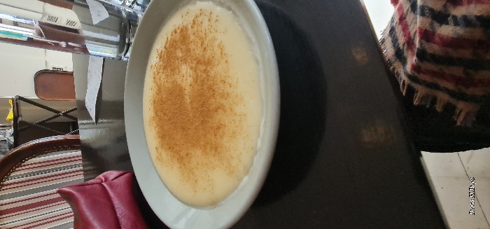 - "An overhead photograph captures a white, shallow bowl containing a pale yellow, viscous substance, generously dusted with light brown powder, centered on a dark, reflective table surface" by FM-PD02y1, licensed under CC BY 4.0