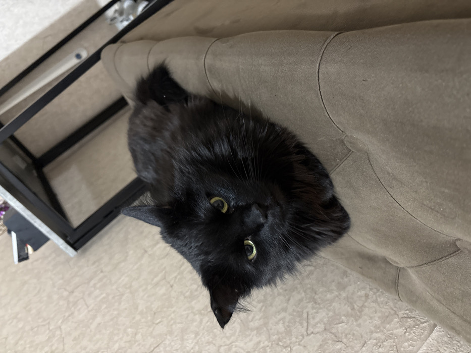 - "The image displays a black domestic cat resting on the backrest of an upholstered piece of furniture within an indoor environment" by FM-oZ3fG3, licensed under CC BY 4.0