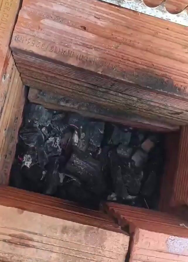 metal bowl with a spinning black center. The bowl is then lifted to reveal an open rectangular brick structure containing burning charcoal. The bricks are stacked, showing markings on their sides, and topped with a perforated metal sheet. The charcoal is glowing red in places amidst the black.