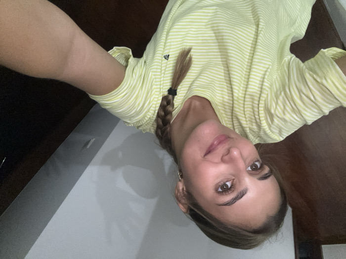 A female individual is depicted in a selfie-style photograph taken indoors. She has light brown hair, styled in a single braid secured with a black elastic band over her left shoulder. Her face, showing a faint smile, is directed towards the camera. She wears a short-sleeved t-shirt with horizontal light green and white stripes, featuring a small, dark logo on the left chest. A gold-colored earring is visible on her right ear. The background consists of a light-colored wall on the upper left, exhibiting a distinct shadow resembling an extended hand. To the right and lower portion of the frame, a dark, angled surface is present, possibly wood paneling or furniture. The indoor setting offers no identifiable architectural or environmental details to determine a specific location. The precise location within Vila Nova de Gaia, Portugal, cannot be determined from the visual information provided.