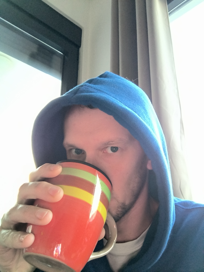 A person wearing a blue hooded sweatshirt drinks from a red, striped mug. The mug has bands of green, yellow, and orange. The person is fair-skinned with light stubble. A window with a black frame is visible to the left, with light shining through. A gray curtain hangs to the right. The image is a close-up, focusing on the person's face and the mug.