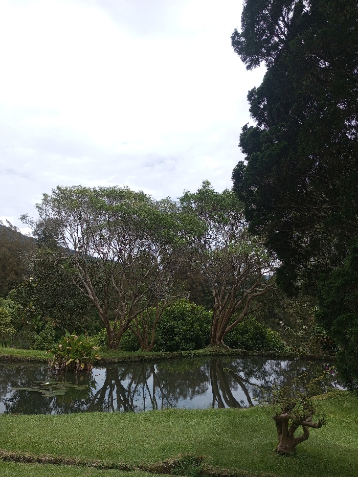 A serene landscape features a tranquil pond reflecting the surrounding trees. Lush green grass carpets the foreground, leading to the water's edge. Two prominent trees with leafy canopies dominate the midground, their reflections mirrored perfectly in the still water. Dense greenery fills the space between the trees. A large, dark tree stands on the right, partially obscuring the view. The sky overhead is overcast with a hint of light breaking through.