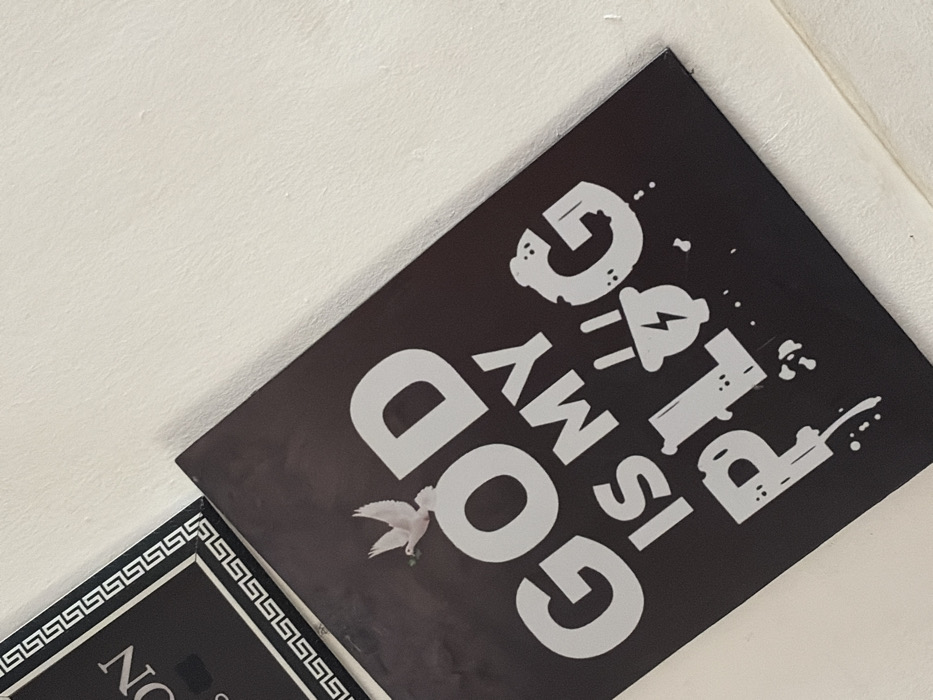 The image displays two distinct objects placed on a light-colored, textured surface, likely a wall or tabletop. The prominent object is a rectangular black print or poster, oriented diagonally from the lower-left to the upper-right corner. It features white sans-serif text proclaiming "GOD IS MY PLUG." A white dove with a green branch in its beak is positioned above the word "GOD." The letter "U" in "PLUG" is replaced by a white electrical plug icon containing a white lightning bolt symbol. Below the word "PLUG," white splatters and drip marks are visible, suggesting a distressed or graffiti-style aesthetic. Partially visible in the upper-left corner is a second black object, possibly another print or a framed item, adorned with a white Greek key (meander) border pattern. The letters "ON" in white are discernible on this secondary object. The scene's exact location within Ogbomosho, Nigeria, is not identifiable from the visual evidence presented.