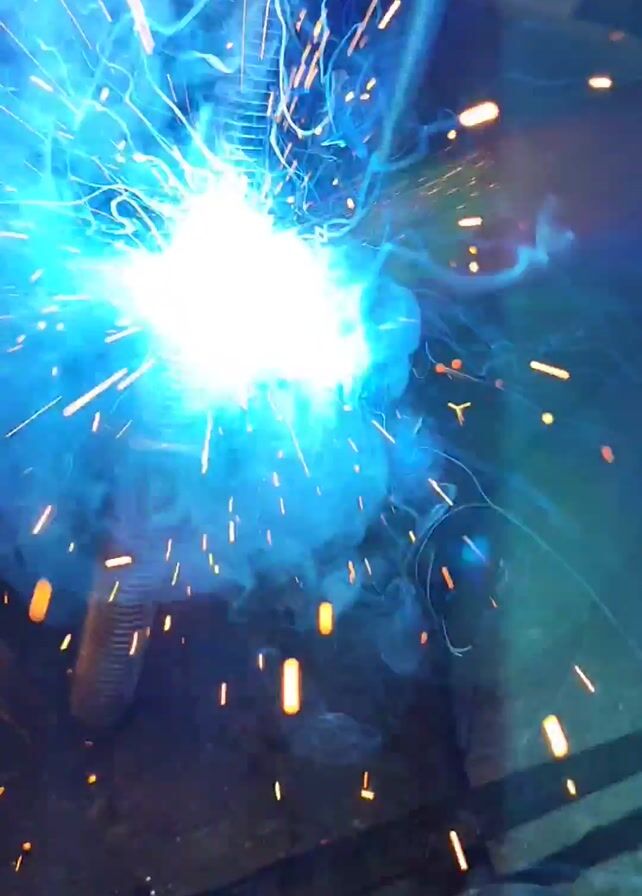 welding. A person is welding a rebar to a threaded rod held vertically in place by a nut. Sparks and bright light are produced during the welding process, along with some smoke. The welding is taking place on a concrete or dirt floor, with a measuring tape nearby.