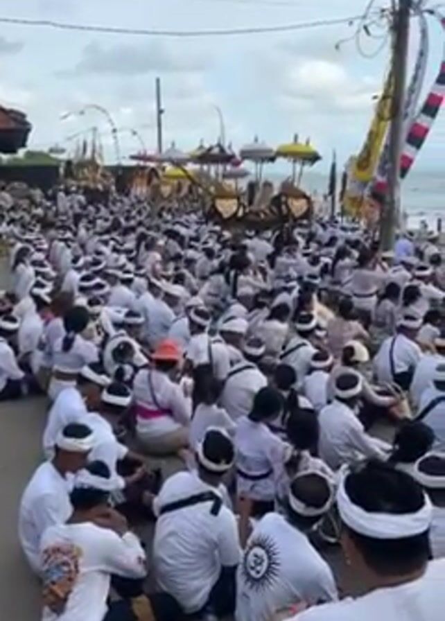 large group of people sitting on the ground in what appears to be a coastal area. Most of them are wearing white tops and white headbands, suggesting they are part of a religious or cultural ceremony. Behind the seated group are several decorative structures, possibly related to the ceremony. The ocean is visible in the background. The sky is overcast. There is also some sound, possibly from musical instruments or chanting, which would further indicate a ceremonial event.