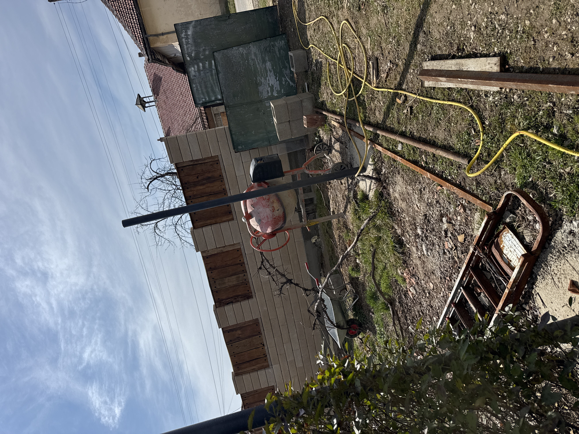 The image depicts an outdoor, unkempt yard or construction area within the city of Staro Selo, Bulgaria, under a partially cloudy blue sky. In the foreground left, a large green leafy bush obscures the view. The ground is a mix of dry earth, sparse green grass, and small rocks, with various construction materials scattered across it. Central to the midground is a worn, reddish-orange concrete mixer with black components, positioned on uneven ground. To its left, a silver-colored wheelbarrow with red wheels rests near bare, tangled vine branches. Behind these, a light-colored concrete block wall with rectangular dark wooden panels forms a boundary. Above and behind this wall, a traditional building with a red tiled roof and a small, bell-shaped architectural feature on its peak is visible, alongside another building with a similar roof. Overhead utility lines traverse the sky. To the right of the concrete mixer, several gray concrete blocks are stacked on the ground next to a single red brick. A large, weathered, dark green metal panel leans vertically further to the right. A coiled yellow electrical cord or hose extends across the ground from the right, running past the stacked blocks towards the mixer. Various pieces of rusty metal pipes, bars, and wooden planks are strewn across the ground in the mid-to-foreground. In the immediate foreground right, a rusty, rectangular metal frame structure lies flat on the ground. No individuals are present in the scene, and no discernible actions or interactions are occurring. The lighting suggests full daylight.