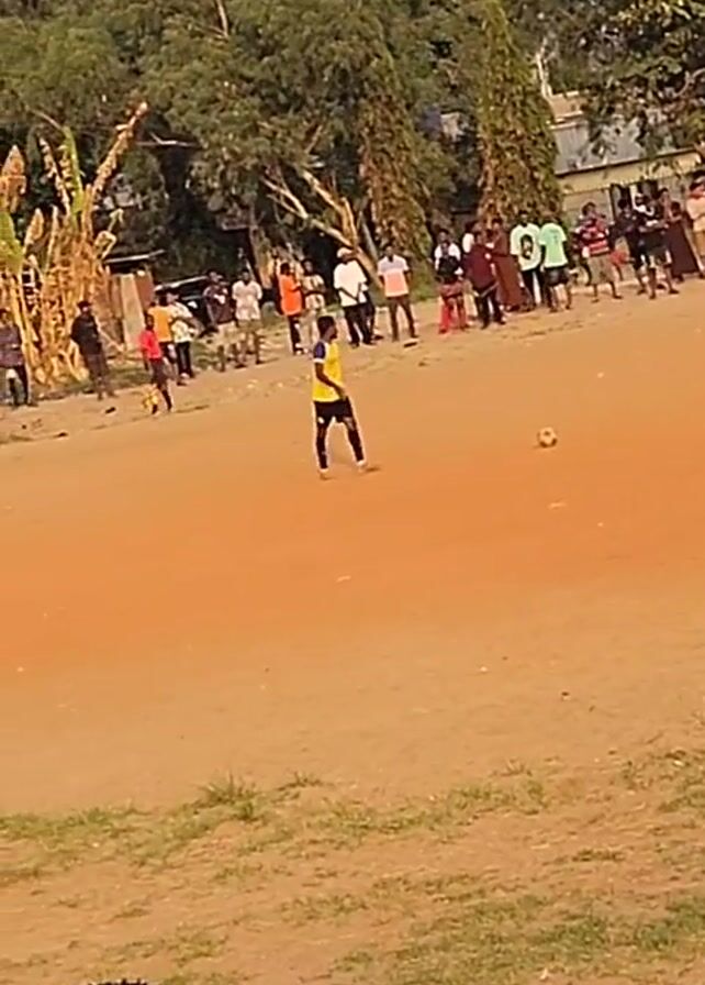 A medium shot shows a group of people playing soccer on a dirt field surrounded by a crowd of spectators