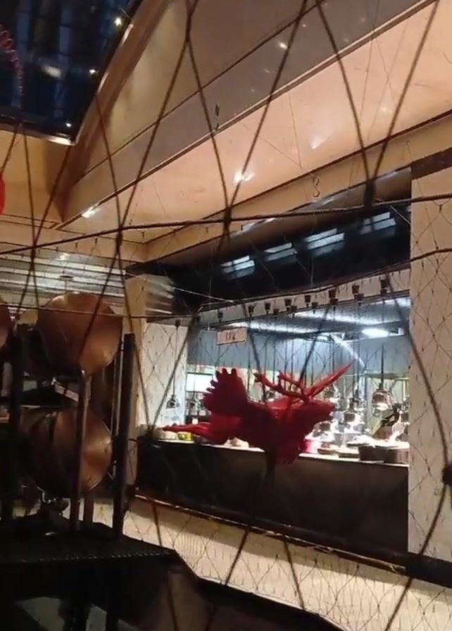 The video depicts the interior of a restaurant or bar from an elevated viewpoint, seemingly behind a wire mesh barrier. Visible in the background is a bar area with a white countertop and illuminated shelves stocked with bottles. Patrons are seated on stools at the bar. Above the bar and the kitchen area, a glass-paned ceiling provides natural light. Suspended from the ceiling are decorative elements: a red abstract object resembling a dragon and a red cylinder with a coiled wire attached. Also visible are what appear to be stacked copper pots or containers. The lighting in the interior is a mix of natural daylight and artificial lighting from the bar area and kitchen.