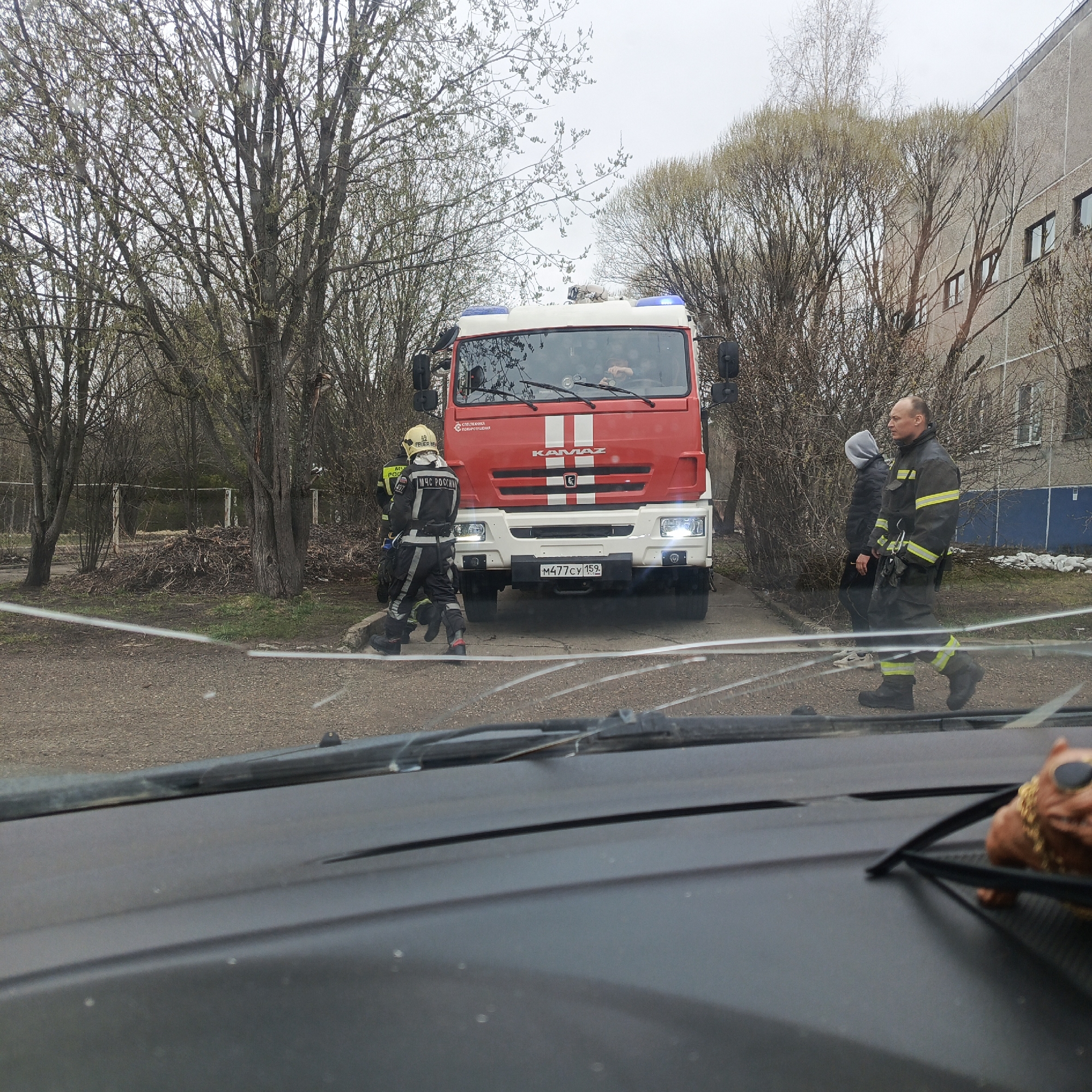 The image was captured from inside a vehicle with a cracked windshield, displaying a view of a fire engine and two firefighters in Markovskii, Russia. The fire engine, a red Kamaz model, is parked in front of a building with several windows, indicating a possible institutional or residential structure. The firefighters are dressed in their protective gear, one of whom is closer to the truck and has the inscription "МЧС России" (Ministry of Emergency Situations of Russia) and what appears to be "FEUERWEHR" on his back. The license plate on the fire engine is visible and reads "M477CY 159". The environment includes trees in the background, some still without full foliage, which could suggest early spring or late autumn. A pile of dry branches is also seen to the left of the fire truck, possibly indicating the reason for the firefighters' presence.