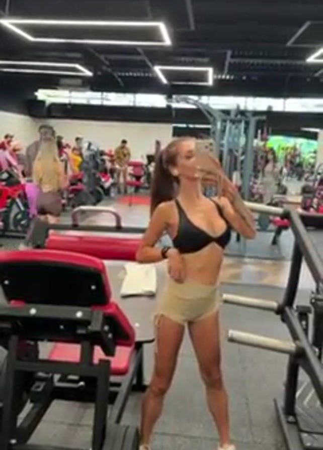 woman in a black sports bra and khaki shorts taking a selfie in a gym. She has long brown hair tied in a ponytail and a tattoo on her left arm. The gym has red and black exercise equipment. Other people are working out in the background. The gym has bright overhead lights and a high ceiling.