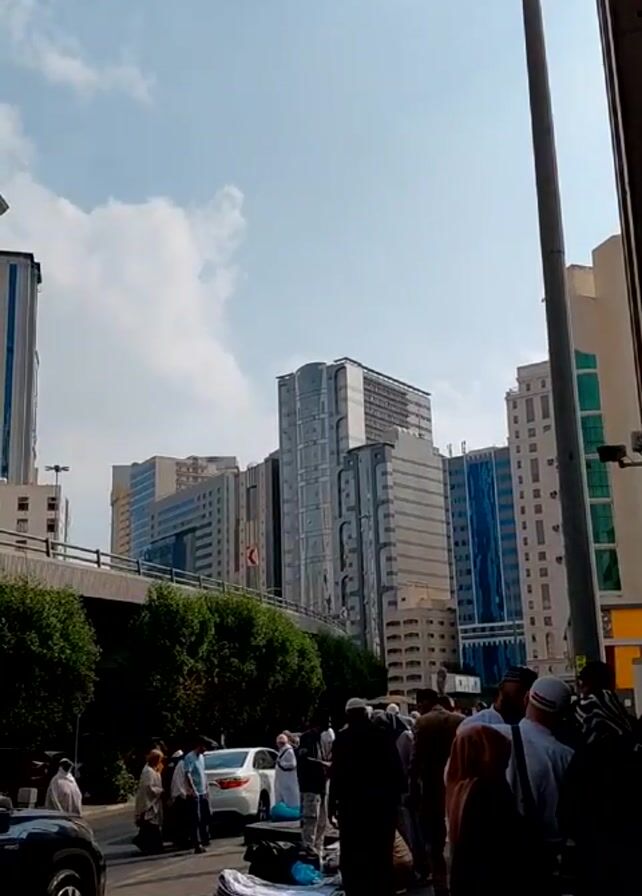 street scene in what appears to be a Middle Eastern city. Tall modern buildings dominate the background under a partly cloudy sky. In the foreground, a group of people, predominantly men, are gathered on the sidewalk. Many are wearing traditional Muslim clothing, including white thobes and head coverings. Some women are also present, wearing hijabs. There are various items laid out on the ground, possibly for sale. A car is parked nearby and other vehicles are visible on the road. There is a bridge in the distance. Overall, the scene depicts a busy urban environment with a distinctly Muslim cultural presence.