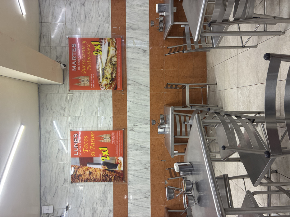 interior of Taqueria Arandas. Two promotional posters are on the wall, advertising food specials. One poster announces a "2x1" deal on "Tacos al Pastor" on Mondays from 4:00 PM to 9:00 PM. The second poster promotes "Quesocarne y Pastorqueso" at "2x1" on Tuesdays from 4:00 PM to 8:00 PM. Stainless steel tables and chairs fill the restaurant space.