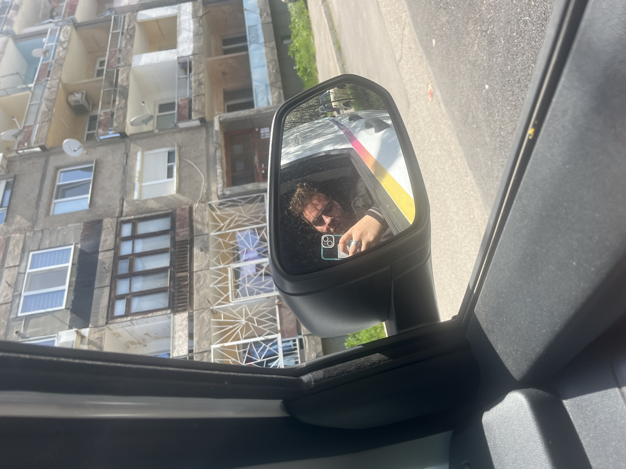 view from inside a vehicle, focusing on the side mirror. The reflection in the mirror features a man wearing sunglasses and holding a phone, presumably taking the picture. Behind the man in the reflection is a white vehicle with a rainbow stripe. The background seen in the mirror and outside the car window reveals a multi-story building with balconies and various window styles. Based on the building’s architecture and appearance, it is likely located in a city with Soviet-era construction, possibly Pernik, Bulgaria, as requested. The weather appears to be sunny. The primary objects are a vehicle side mirror, a man, a building, and a phone. The action is someone taking a photograph using a phone camera.