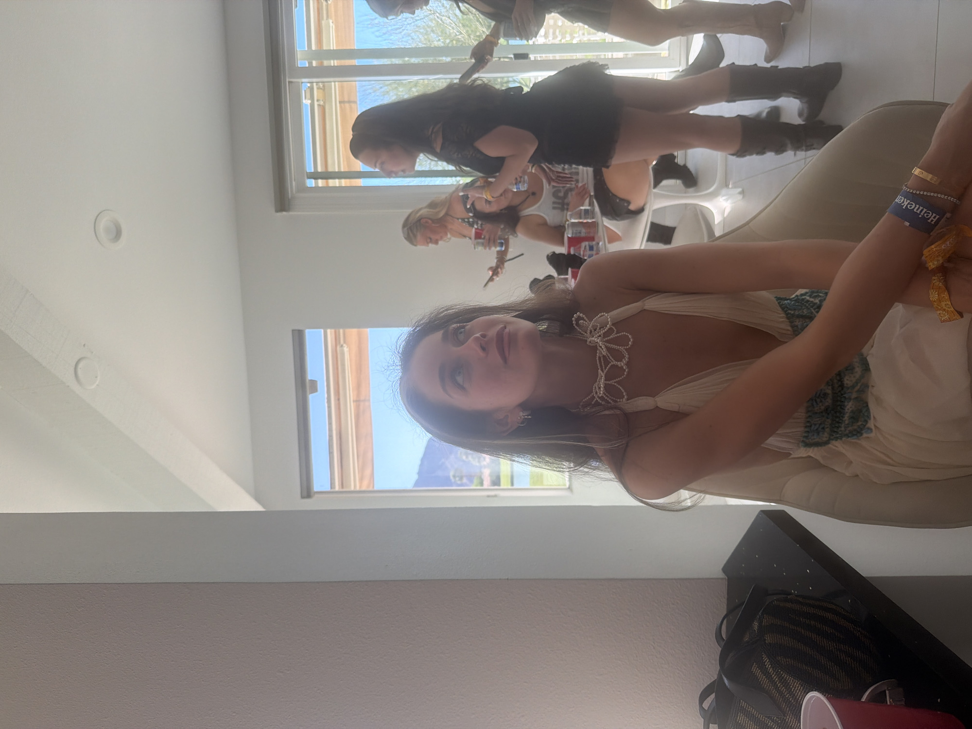group of young women indoors in La Quinta, California. One woman is in the foreground, seated in a chair, wearing a light-colored dress and a beaded necklace. On her wrist are several bracelets and a blue Heineken band. Behind her, other women are visible in the background standing by a window. Some are holding drinks. The environment appears to be a room in a residence or hotel. Outside the window is a view of desert landscape and mountains. A table with a bag and other items is to the right in the foreground.