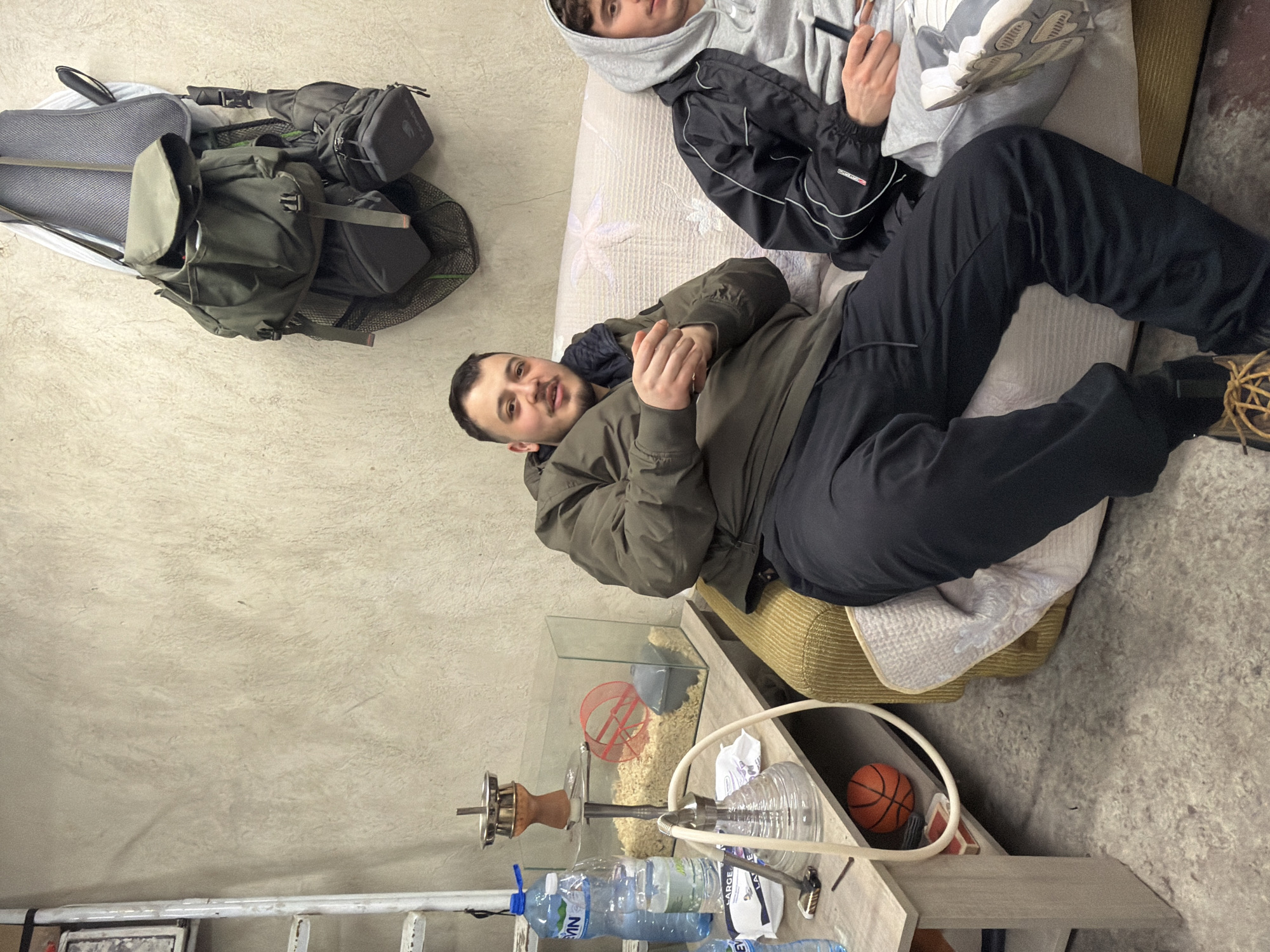 This image captures two males seated on a light-colored fabric sofa within an informal indoor setting, likely in Varna, Bulgaria. The walls are finished with a textured, light beige plaster, and the floor is a mottled gray. The male in the foreground, appearing to be in his 20s or early 30s, has short dark hair and a light mustache and beard. He wears a dark olive green puffer jacket over a dark blue underlayer and black track pants, with brown and orange-laced shoes. His hands are clasped, and he is looking directly at the camera with a neutral expression. To his right, a younger male, partially visible, wears a gray hooded sweatshirt under a black track jacket with white accents and white and gray sneakers. He is looking downwards, holding a dark object in his right hand. To the left of the sofa, a light-colored wooden side table holds two clear plastic bottles, one clearly branded "DEVIN" water. A glass hookah with a metal and wood stem, a clear base, and a light-colored hose sits on the table. Adjacent to the hookah is a clear glass hamster cage containing wood shavings, a red exercise wheel, a grey shelter, and a small hamster. A small orange basketball is visible on the lower shelf of the table. On the wall behind the sofa, several bags and backpacks are hanging, including a large grey backpack frame, an olive green shoulder bag, and smaller dark pouches. A white metal structure, possibly a ladder or shelving unit, is partially visible on the far left of the frame.