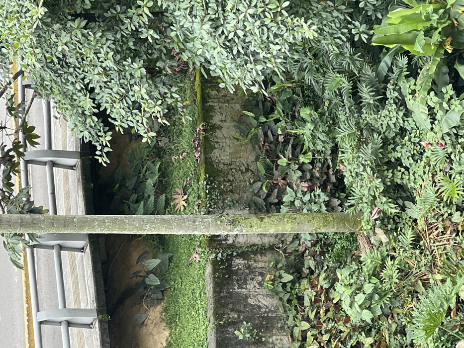 The scene depicts a heavily vegetated embankment beneath an elevated concrete structure in Medellín, Colombia. The upper portion displays a grey metal railing with two horizontal bars and multiple vertical supports, positioned along the edge of a light-colored concrete surface. Below this walkway, an earthen slope covered in short green ground cover and scattered dry leaves descends to a dark, moss-covered concrete retaining wall. A prominent, vertically oriented tree trunk with textured, light brown bark, partially obscured by green growth, stands in the left-center, extending upwards from the lower vegetation. The lower half and right side of the image are densely filled with varied tropical foliage, including large-leafed plants, ferns, and numerous bushes, exhibiting vibrant green and some reddish-brown hues. No individuals, animals, or specific identifying street markers are visible. The environment is consistent with an urban green space or infrastructure corridor typical of Medellín's terrain and climate.