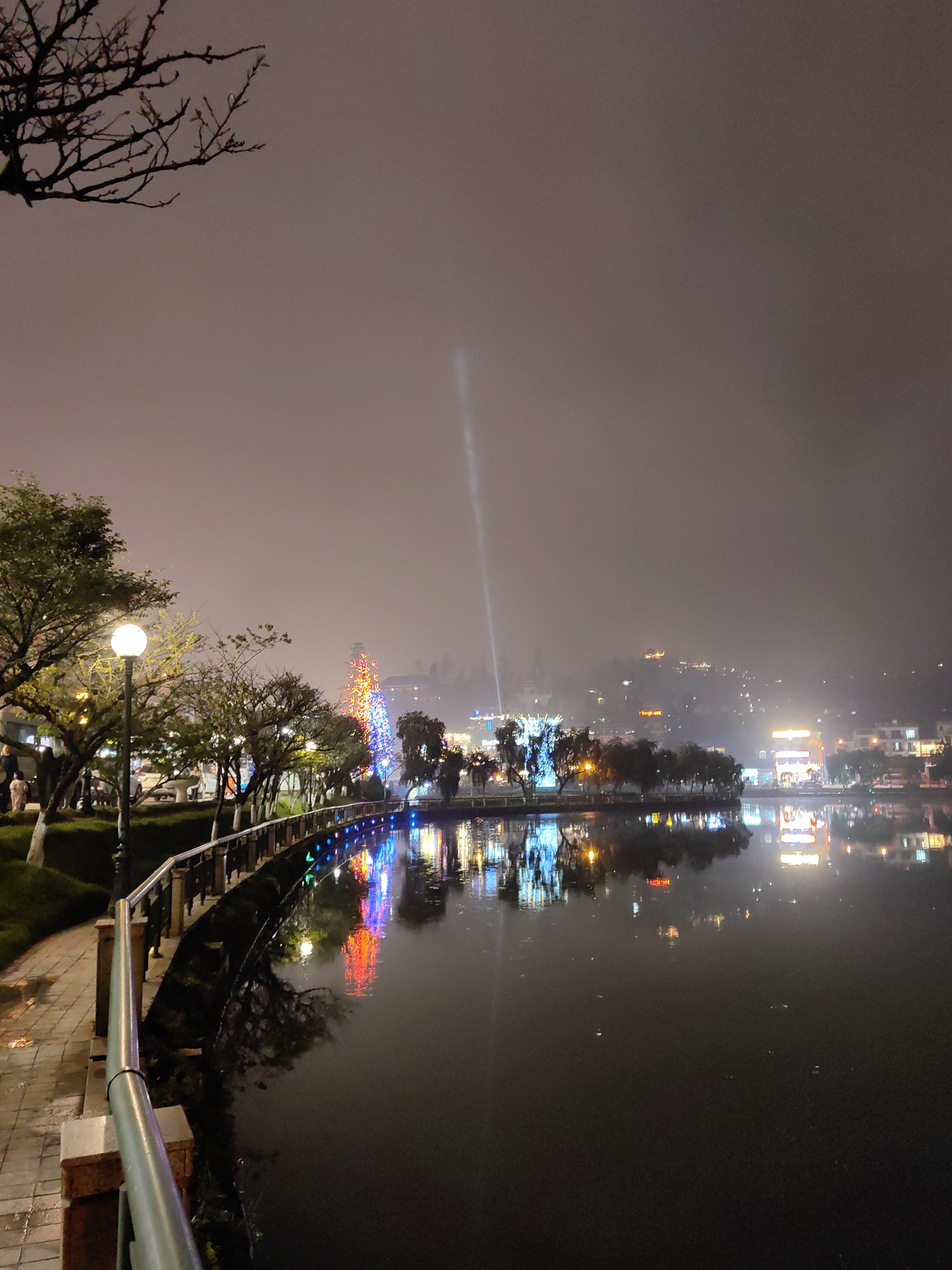 The image depicts Sa Pa Lake in Sa Pa, Vietnam, at night, under hazy atmospheric conditions. In the immediate foreground on the left, a wet, paved pedestrian walkway with rectangular pavers extends along the lake's edge, bordered by a silver-colored metal handrail. A narrow strip of green grass separates the walkway from a line of trees, some with sparse foliage and others appearing largely bare. Several streetlights, featuring spherical white globes, illuminate the walkway and trees. Indistinct human figures are visible walking on the pavement or standing near the trees in the mid-left. The dark, calm surface of Sa Pa Lake occupies the majority of the midground and right side of the frame, providing extensive reflections of artificial lights. A prominent, tall, conical structure adorned with multi-colored lights (red, green, blue, yellow), resembling a Christmas tree, stands illuminated on the opposite shore, its vibrant reflections shimmering on the water. Further along the lakefront, another large structure emits a strong blue light, also reflected in the water. The background shows the illuminated outlines of buildings and urban development on the distant, elevated terrain of Sa Pa, with lights ascending into the mist. A single, distinct, narrow beam of white light projects vertically into the hazy, uniform grey sky from an unseen source on the far side of the lake. Bare tree branches are visible in silhouette against the overcast sky in the upper left corner.