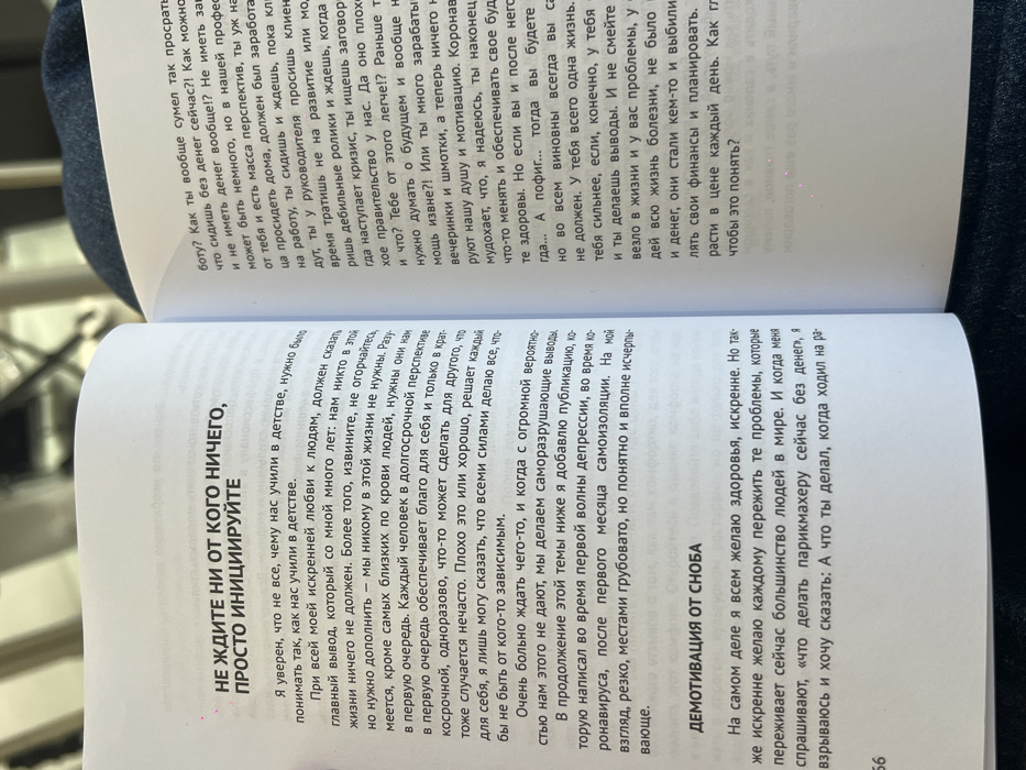 The image displays an open book, likely a softcover edition, with white pages densely covered in black Cyrillic text, indicative of the Russian language. The book is viewed from a slightly elevated angle. The left page features a prominent, bolded heading at the top: "НЕ ЖДИТЕ НИ ОТ КОГО НИЧЕГО, ПРОСТО ИНИЦИИРУЙТЕ" (Don't wait for anything from anyone, just initiate), followed by multiple paragraphs of standard body text. Further down this page, another bolded sub-heading, "ДЕМОТИВАЦИЯ ОТ СНОБА" (Demotivation from a snob), is visible, above more text. The page number "66" is printed at the bottom left corner. The right page is also filled with multiple paragraphs of black Russian text. Both pages exhibit faint pink speckles or dust particles. The book's central binding is visible where the pages meet. The immediate background above the left page is a light, indistinct surface. Above the right page, a dark, textured fabric, consistent with denim, is visible, suggesting the book is resting on a lap or piece of clothing. No individuals are depicted, and no specific actions or interactions are occurring beyond the open book itself. The location in the city of Hrodna, Belarus, cannot be determined from the visual information presented in the image.