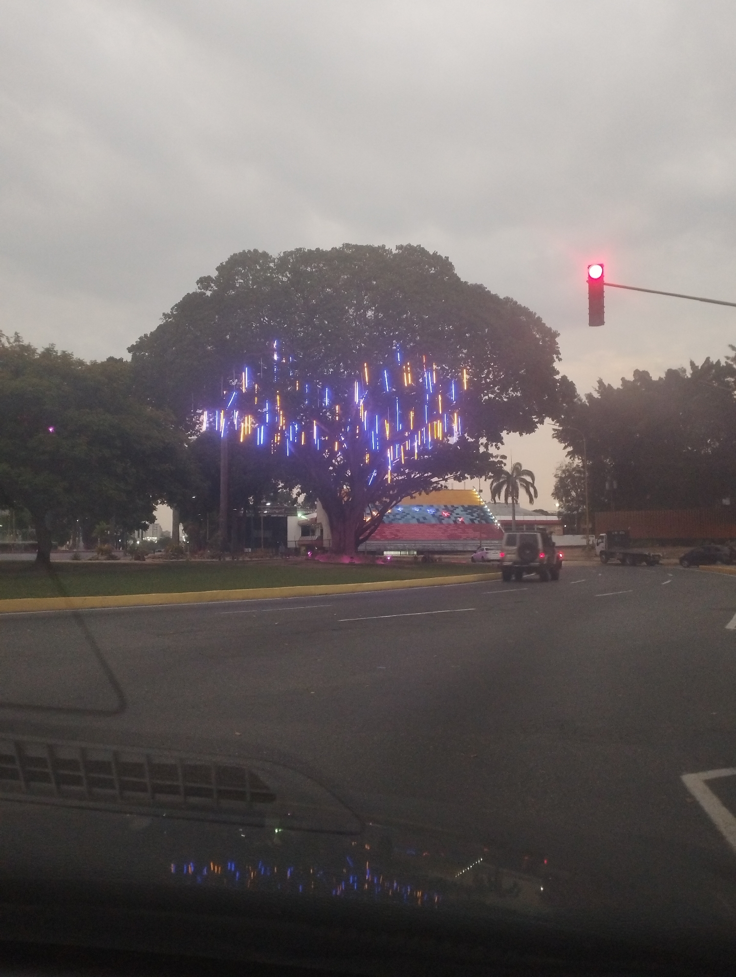 The image, taken from inside a vehicle, shows a street scene in Valencia, Venezuela. A large tree decorated with vertical blue and yellow lights is the focal point, positioned on a median separating traffic lanes. Behind the tree is a structure with red, blue, and yellow colors, possibly a monument or building. Several vehicles are present on the roadway, including an SUV in the center lane. A red traffic light is visible in the upper right of the frame. The sky is overcast. The camera is positioned behind the windshield of a vehicle.
