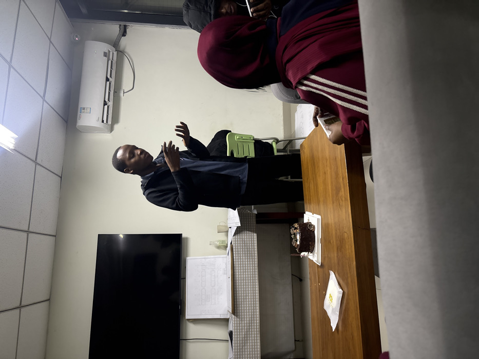 This image depicts an indoor scene in Jiangjin, China. The setting appears to be a common room or a meeting space with light-colored walls and a white drop ceiling equipped with fluorescent strip lighting. In the foreground, a dark wooden table occupies the center, upon which a small, round chocolate cake with a white paper base is placed to the left. To the right of the cake, a wrapped white item, possibly a napkin or small package, rests. A grey upholstered sofa or bench is partially visible in the bottom foreground, with an individual's back turned towards the camera, wearing a maroon hooded top with white stripes on the sleeve, holding a small white object. To the right of this individual, another person is partially visible, wearing a dark hooded garment and holding a smartphone. In the mid-ground, a dark-skinned male, estimated to be in his late 20s or early 30s, stands centrally. He is dressed in a dark blue or black zip-up hoodie over a lighter blue collared shirt and dark trousers. His hands are gestured open, palms facing upwards, suggesting he is speaking or explaining something to the seated individuals. Behind him to the left, a long black flat-screen television is mounted on the wall. Below the TV, a white rectangular table with a light grey and white checkered tablecloth holds several papers, a white mug, and a glass bottle. To the right of the standing male, a light green plastic chair is visible against the wall. A white air conditioning unit is mounted high on the wall to the right of the standing male.