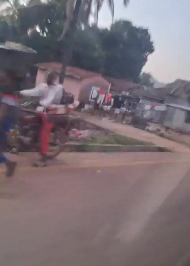 From the perspective of a moving vehicle, the video shows a roadside scene in a rural area. There are several buildings with tin roofs and laundry hanging to dry outside. People can be seen walking and standing along the road. The weather appears to be sunny. Palm trees are visible in the background.