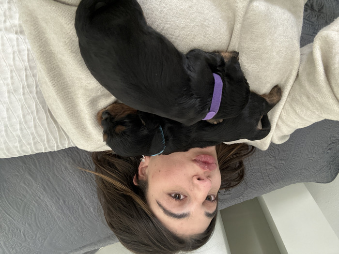 - "A woman lies on a grey patterned bed with a beige sweater, two dark puppies resting on her chest" by FM-OKeT52, licensed under CC BY 4.0