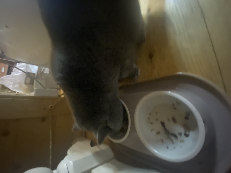 A gray cat eats from a white dish on a gray tray. The dish has dark food remnants. Another empty white dish sits adjacent to the first. The background shows light-colored wooden panels and a cluttered countertop with a white lampshade. The perspective is from above, looking down at the cat and its feeding station.