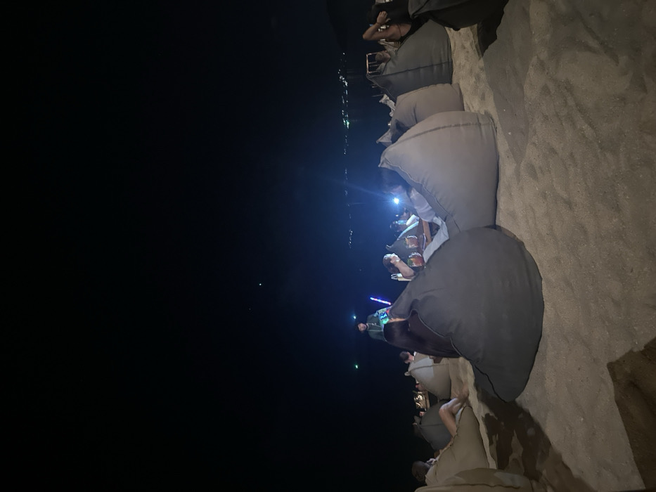 This image depicts a nighttime social gathering on a sandy beach in Baan Bo Phut, Thailand