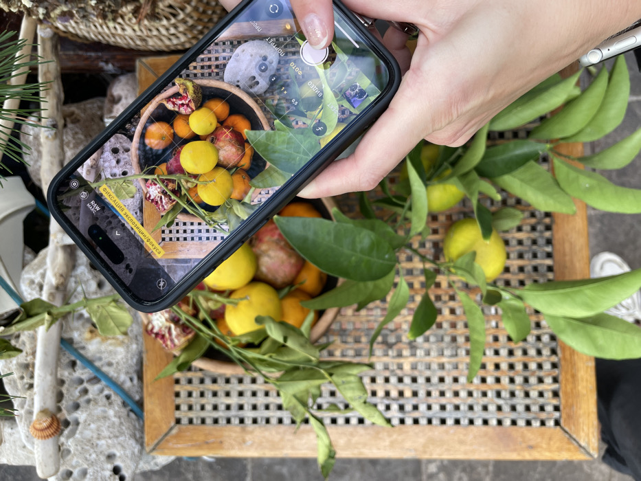 An overhead, slightly angled photograph depicts a person's hands holding a black-cased iPhone, actively using its camera application to capture a still life composition
