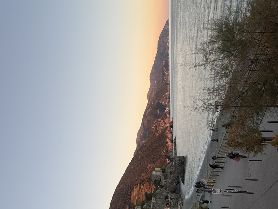 The image presents a coastal scene in Monterosso al Mare, Italy, viewed during a low-light period, indicative of either sunrise or sunset. The sky displays a gradient, transitioning from light blue in the upper portion to warm orange and pink hues near the horizon. The Ligurian Sea occupies the central and right, appearing calm with a silvery-grey surface reflecting the sky, and gentle wave activity on a pebbled beach. In the mid-ground, a paved promenade runs parallel to the coastline. It is separated from the beach by a black metal railing and features several black bollards. A white circular sign with a red border and a diagonal line is mounted on a pole on the promenade. Approximately ten individuals are present: several are walking along the promenade, one person is notably dressed in a red garment and carrying a bag. Other individuals are visible walking on the pebbled beach closer to the water's edge. To the left, steep, heavily vegetated mountains rise abruptly from the sea. Terraced cultivation is visible on the lower slopes, along with several stone buildings. A prominent historic tower-like structure is situated on a rocky outcropping extending into the sea, immediately adjacent to the beach. A short, rocky breakwater juts into the water beyond this outcrop. The mountainous coastline extends into the distance towards the right, appearing increasingly softened by atmospheric perspective. Sparse, bare-branched vegetation partially obscures the lower right foreground.
