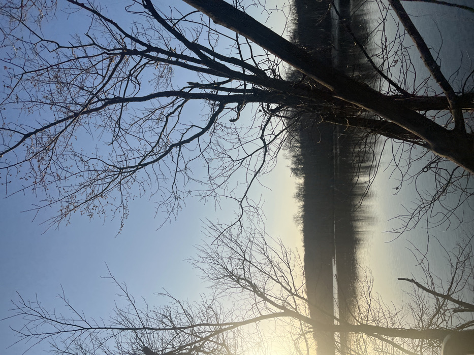 The image displays a natural landscape scene within the Village of Monroe, United States of America, captured during either sunrise or sunset. The upper portion of the frame is dominated by a clear, gradient blue sky, lighter towards the horizon where a bright light source, presumably the sun, is partially obscured on the left. The middle and lower sections feature a tranquil body of water, possibly a lake or river, which reflects the sky and surrounding environment with a smooth surface. Several deciduous trees, devoid of leaves, stand prominently in the foreground and midground, their dark, intricate branches silhouetted against the bright sky and reflective water. A large, thick tree trunk angles diagonally from the upper right towards the lower center-right. A dense, dark line of forested land extends across the far bank of the water. No individuals, animals, or artificial structures are discernible within the scene.