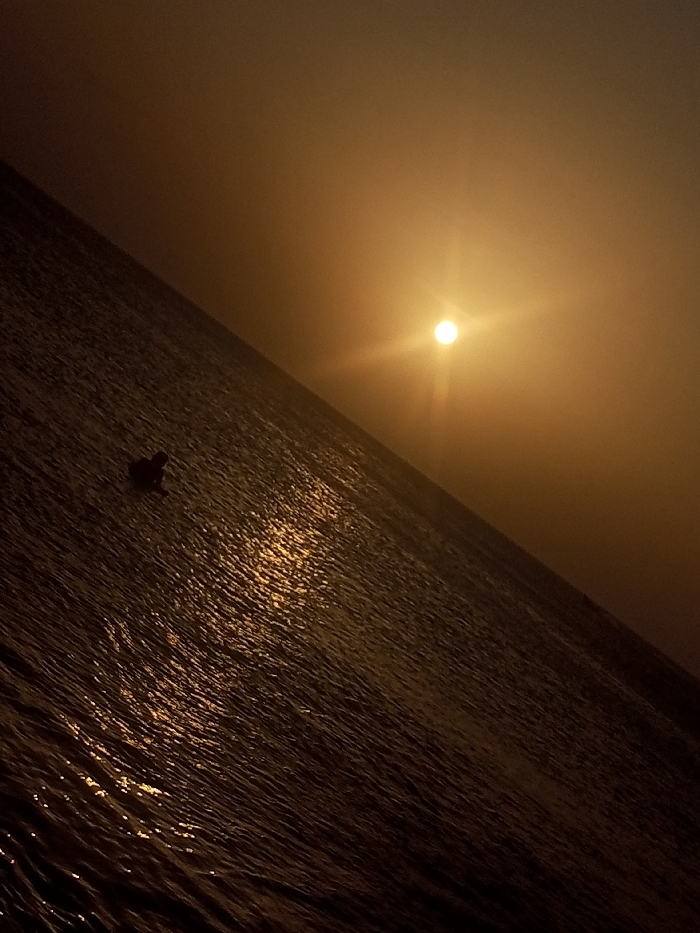 The image depicts a coastal scene in Juan Griego, Venezuela, under twilight conditions. A distinct diagonal horizon line separates a hazy, orange-brown sky in the upper-right from a dark, rippled body of water in the lower-left. A luminous, circular sun is prominently positioned in the upper-right quadrant of the sky, emitting a radiant glow and casting a vivid golden reflection path across the water surface. In the middle-left section of the water, a solitary, dark, silhouetted human figure is observed. The figure appears to be partially submerged or seated on an unidentifiable, low-profile watercraft. No other individuals or significant objects are discernible, and no specific actions or interactions are evident within the frame.
