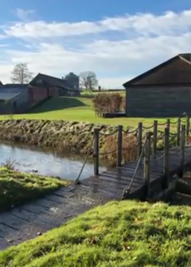 The video presents a daytime view of a rural landscape. A small, wooden bridge spans a narrow waterway, possibly a stream or canal. The bridge has rope railings, and both its surface and the surrounding walkways appear damp, perhaps from recent rain or morning dew. Lush green grass covers the banks of the waterway. In the background, several farm buildings are visible, including what appears to be a silo. The sky is blue with scattered white clouds, suggesting a bright, sunny day. The overall impression is a peaceful, countryside scene.