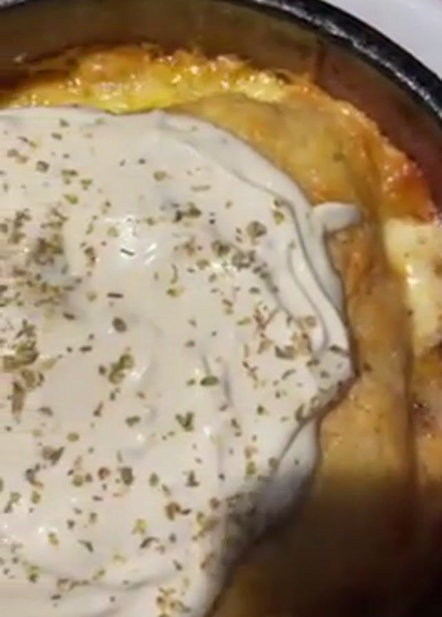 close-up of a dish served in a dark clay pot. The dish appears to be some sort of pastry or casserole, topped with a generous dollop of white sauce. The sauce is sprinkled with dried green herbs. The pot sits on a white plate, and the background is slightly blurred. The camera moves slightly, showing different angles of the dish.