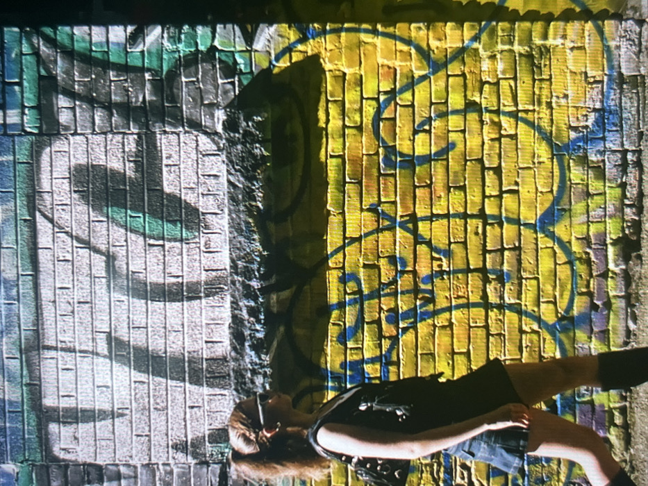 A person lies horizontally against a graffiti-covered brick wall. The wall is divided, with one side painted in shades of gray and blue, the other in yellow with blue graffiti. The person is dressed in black attire, including a top and shorts, with black boots. The individual's face is partially visible. The light is uneven, casting a shadow between the two wall sections.