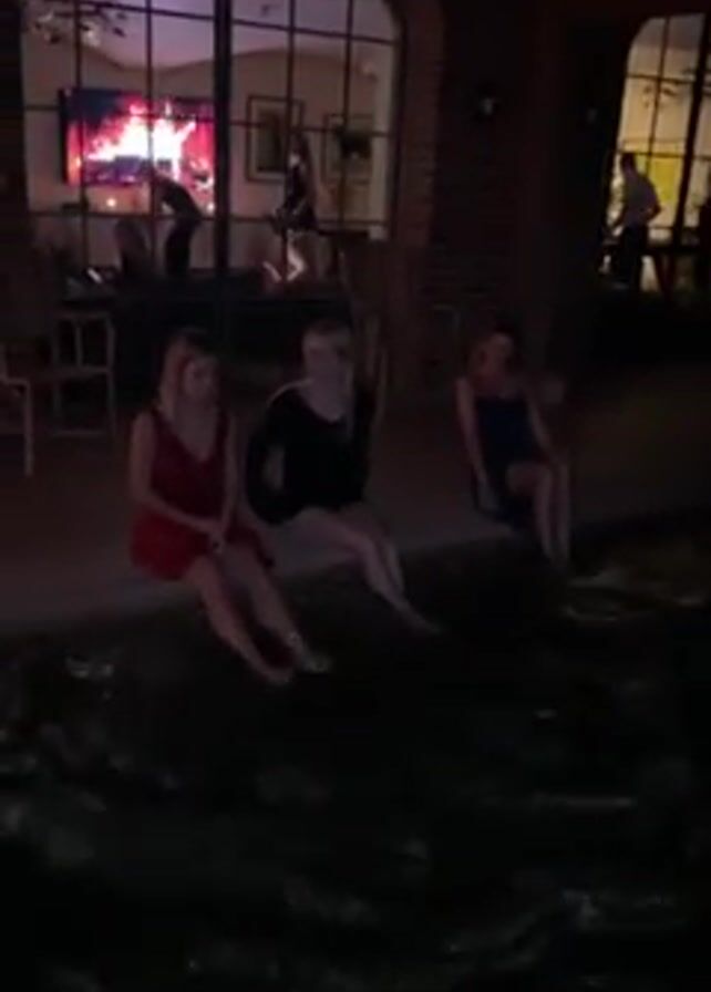 three young women sitting on the edge of a pool, with their legs dangling in the water. The woman on the left is wearing a red dress, the woman in the middle is wearing a black dress, and the woman on the right is wearing a blue dress. They appear to be outside at night. In the background, visible through glass doors, are other people and a room illuminated with light and what appears to be a TV screen showing an image of a fireplace. The video is a little shaky and the lighting is low, making some details difficult to discern clearly.