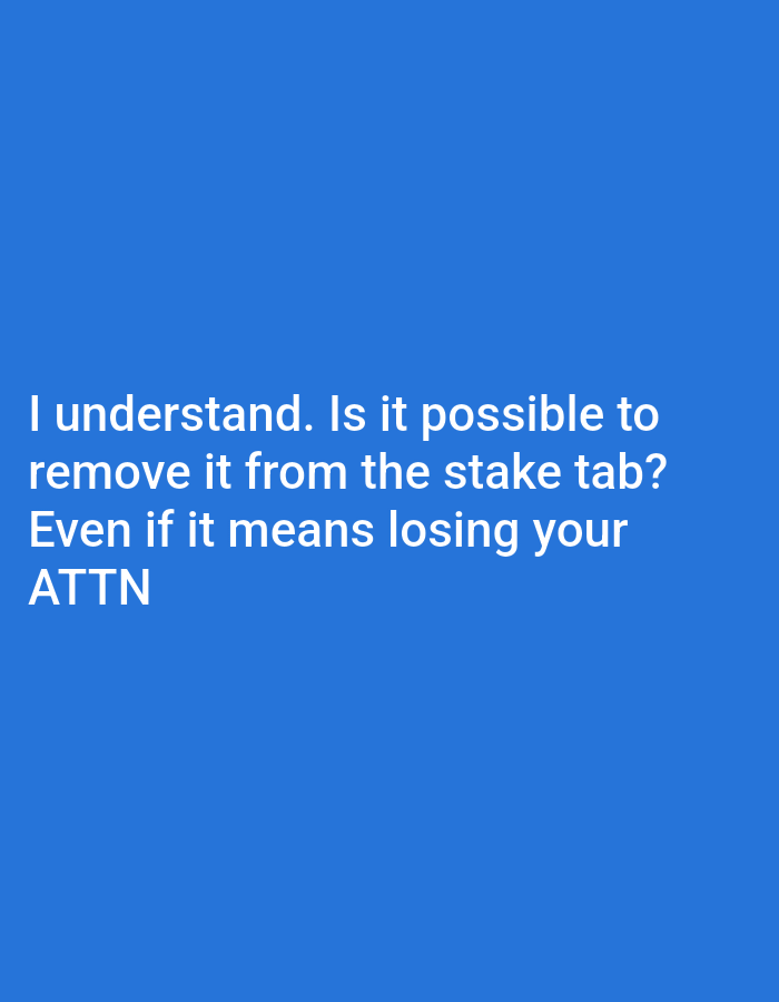 The image displays white sans-serif text against a solid royal blue background. The text reads: "I understand. Is it possible to remove it from the stake tab? Even if it means losing your ATTN". There are no visual elements depicting a location, individuals, subjects, objects, actions, or interactions. The image contains only text on a colored background; therefore, no information regarding the city of Guyancourt, France, or any other specific environment is present.