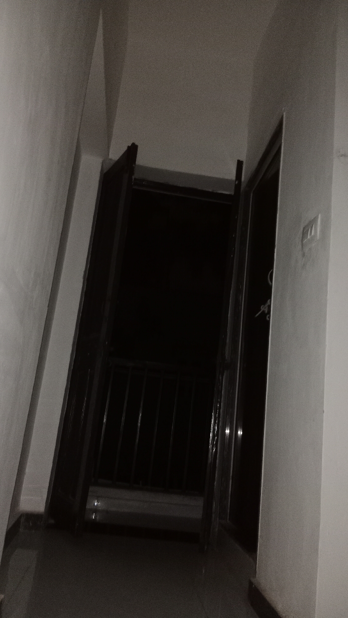 An interior shot shows an alcove with two doorways. The left doorway, framed in dark wood, leads to a dark space with a wrought iron railing. Light reflects off a glossy floor. The right doorway, also dark, is surrounded by a lighter frame and abuts a wall with a light switch. The overall scene has a monochrome, grayscale feel.