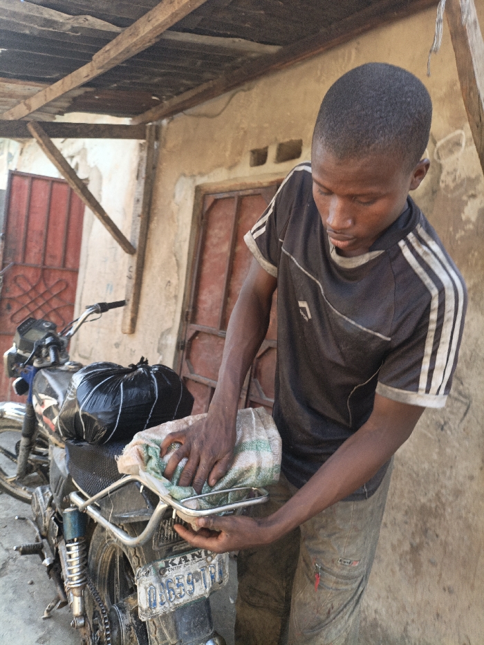In Tarauni, Nigeria, a young male, dark-skinned with short dark hair, is depicted in a medium shot. He wears a dark grey short-sleeved t-shirt with white stripes on the sleeves and soiled light-colored trousers. He is bent over, focused on wiping a metallic luggage rack on the rear of a dark-colored motorcycle using a multi-colored cloth held in both hands. The motorcycle, heavily soiled with mud on its rear wheel and fender, has a black plastic bag secured on its seat. A Nigerian license plate is clearly visible on the rear, reading "KANO," "CENTRE OF COMMERCE," and "DB 659-TBU." The scene unfolds outdoors, on a dusty ground surface, in front of a light brown, weathered building featuring two red, barred metal doors. Above, a makeshift shelter of wooden beams and corrugated metal roofing provides shade.