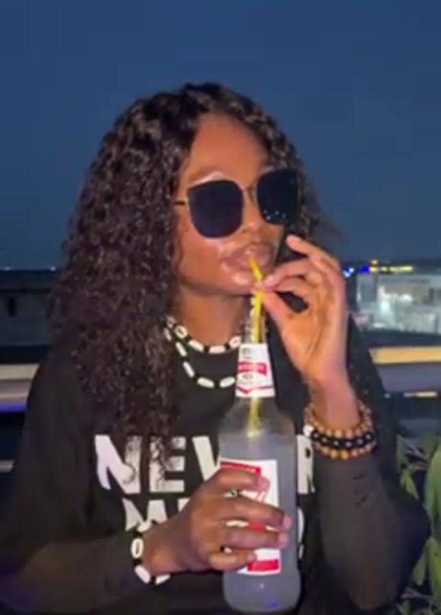 A woman in black attire, including a "NEVER MIND" T-shirt and dark sunglasses, sips from a bottle with a yellow straw. She wears two necklaces, one of which is made of what appears to be shells. One of her hands is around the bottle, and the other rests on the straw as she drinks. A wooden beaded bracelet adorns her wrist. The background reveals a rooftop view at night, with city lights in the distance, separated by a metal railing. The setting is outdoors.