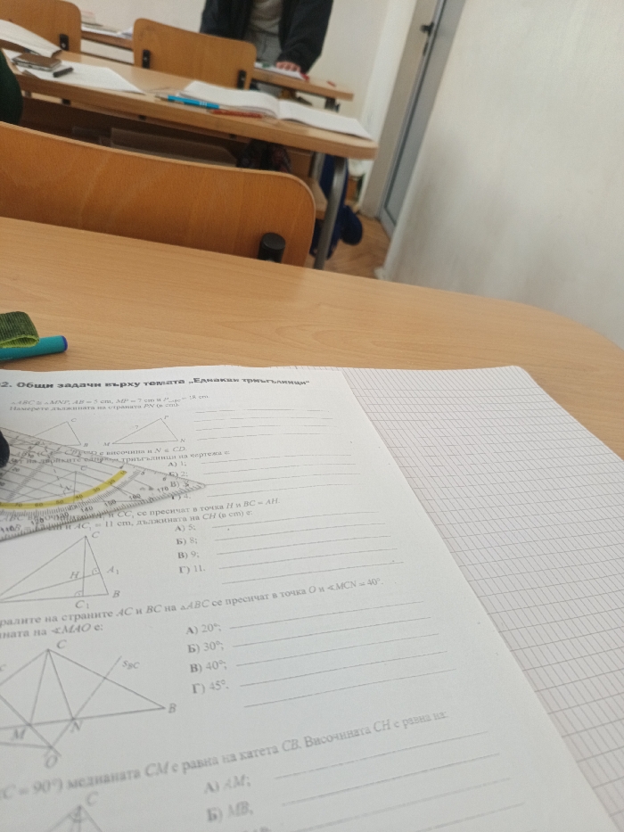 The image depicts an indoor classroom environment within an educational institution in Dobrich, Bulgaria. The foreground is dominated by a light-colored wooden student desk, upon which an open white textbook or worksheet is centrally positioned. The document displays geometric problems and diagrams, with a visible title in Bulgarian translating to "GENERAL PROBLEMS ON THE TOPIC 'CONGRUENT TRIANGLES'." A partial circular protractor with yellow markings overlays one of the diagrams. To the immediate left of the textbook, a teal-colored marker pen with a green cap is present. To the right, a blank, gridded notebook page is visible. Beyond the foreground desk, multiple rows of similar light-colored wooden desks and chairs recede into the midground, slightly out of focus. One individual, wearing a dark jacket over a lighter garment, is partially visible in the upper midground, standing or leaning over a desk. The background features a plain light-colored wall on the right, with a dark-handled door frame partially visible at the far right edge. The floor, visible beneath the desks, also appears light-colored. The scene suggests an active learning or examination setting.