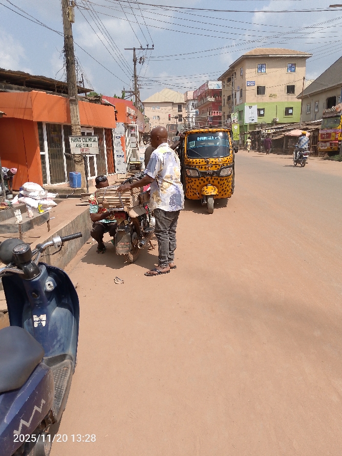 The image depicts a daytime street scene in Nnewi, Nigeria, showing a bustling commercial environment. In the immediate foreground on the left, the handlebars and partial front section of a dark blue scooter are visible. Moving into the midground, two adult males are engaged with a dark-colored motorcycle positioned on the roadside. The man on the left, wearing a light-colored patterned shirt and dark trousers, stands facing left, appearing to hold or adjust bundles of what resemble wooden planks or stakes secured to the motorcycle's rear. The second man, wearing a patterned shirt and dark trousers, squats behind the motorcycle, actively securing these bundles. To their right, a yellow auto-rickshaw (Keke Napep) with a distinctive black leopard-spot pattern is parked on the reddish-brown dirt road, facing away from the camera. The words "BASHELLA" and "TVS" are visible on its front. The street extends into the background, lined with various multi-story commercial buildings. On the left, an orange building features a white sign stating "PAINT CHEMICAL ARE SOLD HERE," with white sacks and a blue jerrycan placed on the ground nearby. Further down the street on the right, a three-story building with a cream upper facade and a green lower section is visible. Numerous utility poles with a dense network of overhead wires span across the street. The road surface is predominantly unpaved reddish-brown dirt, with areas of darker compacted material. Scattered pedestrians and other vehicles, including motorcycles, are visible further down the street, indicating ongoing traffic and activity. The scene is brightly lit by daylight, casting distinct shadows. A digital timestamp "2025/11/20 13:28" is present in the lower-left corner.