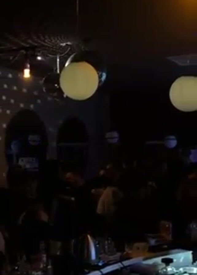 interior of a dimly lit bar, possibly a nightclub, with people milling about. There are several spherical light fixtures hanging from the ceiling, some opaque white and others resembling disco balls. A bar counter is visible in the foreground, cluttered with bottles and bar equipment. People are standing and moving around near the bar, with their features obscured by the low lighting. A screen with blue and white abstract patterns is visible in the background.